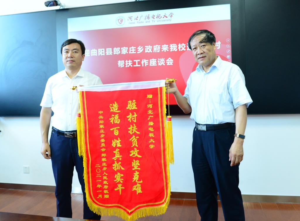 2021年6月18日,曲陽縣郎家莊鄉黨委書記甄盼興一行來我校贈送脫貧攻堅工作錦旗,我校黨委副書記岳俊輝出席贈送儀式并進行了座談。