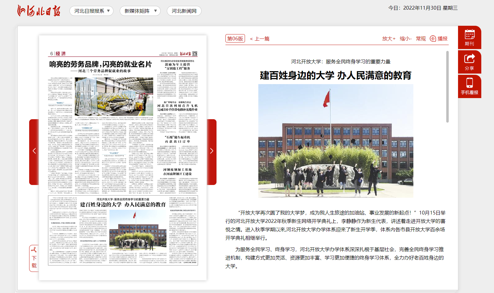 11月30日,河北日報第6版開辟專欄,以《建百姓身邊的大學(xué) 辦人民滿意的教育》為題,報道我校兩年來扎實推進(jìn)開放大學(xué)轉(zhuǎn)型發(fā)展的成果與成效,全文如下。