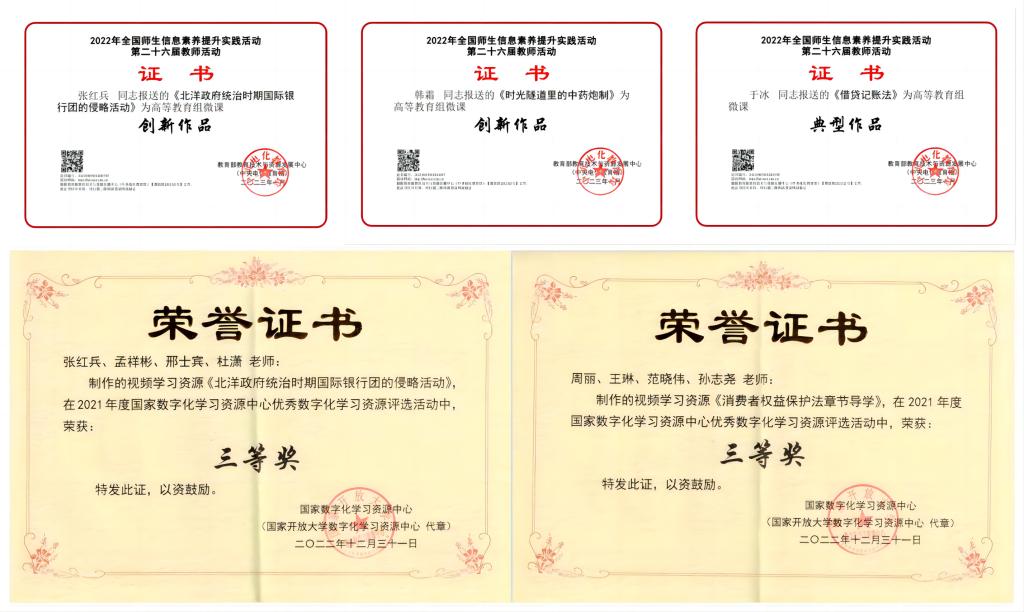 日前,由教育部教育技術與資源發展中心(中央電化教育館)主辦的“2022年全國師生信息素養提升實踐活動(教師部分)(原第二十六屆全國教師教育教學信息化交流活動)圓滿結束,我校推薦的5件作品中有3件喜獲嘉獎,其中張紅兵老師的《北洋政府統治時期國際銀行團的侵略活動》和韓霜老師的《時光隧道里的中藥炮制》分別被評選認定為高等教育組微課“創新作品”,于冰老師的《借貸記賬法》被評選認定為“典型作品”。