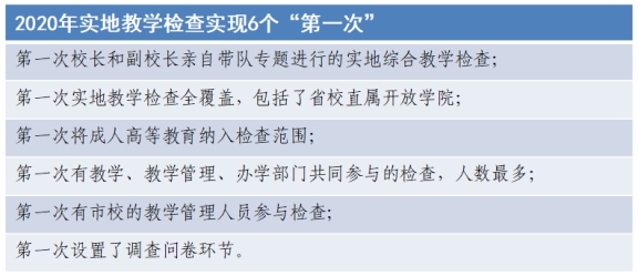 10月初,我校制定了實地綜合教學(xué)檢查方案,細(xì)化了檢查內(nèi)容和程序,為實地綜合教學(xué)檢查的順利開展奠定了基礎(chǔ)。10月12日,召開了2020年實地綜合教學(xué)檢查部署視頻會,郭立志對實地綜合教學(xué)檢查進(jìn)行了部署。這次檢查主題鮮明、目的明確,實現(xiàn)了6個“第一次”。